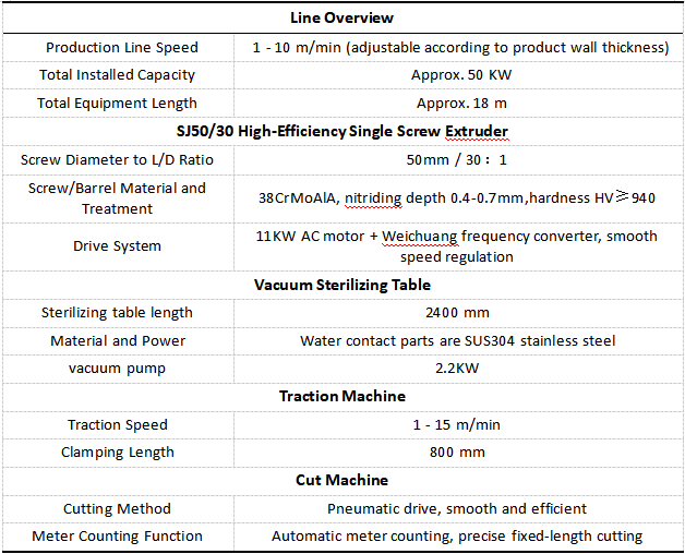 The setup for this lamp tube cover production line centers around some key equipment details. At the heart sits the SJ50/30 single-screw extruder. It features a 50mm screw with a 30 to 1 length to diameter ratio. Both the screw and barrel come from nitrided 38CrMoAlA steel, which helps melt materials completely, keeps things even, and delivers steady output even for tough stuff like PC, PS, and ABS. Lamp tube cover production line pairs an 11 kW AC motor with a Weichuang frequency converter, so speed stays under precise control. Plus, an automatic vacuum feeder and dehumidifier dryer takes care of moisture in raw materials like PC and ABS, making sure the melt stays high quality for the extrusion process. The whole line gets central control through Siemens low-voltage parts and Omron temperature controllers, which keeps everything running reliably.